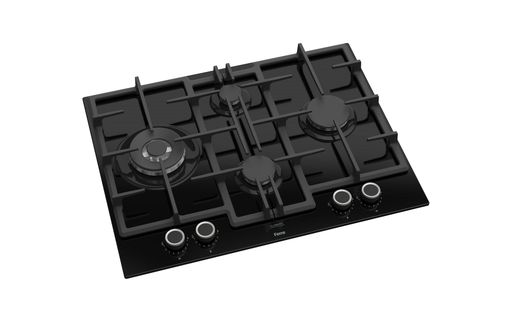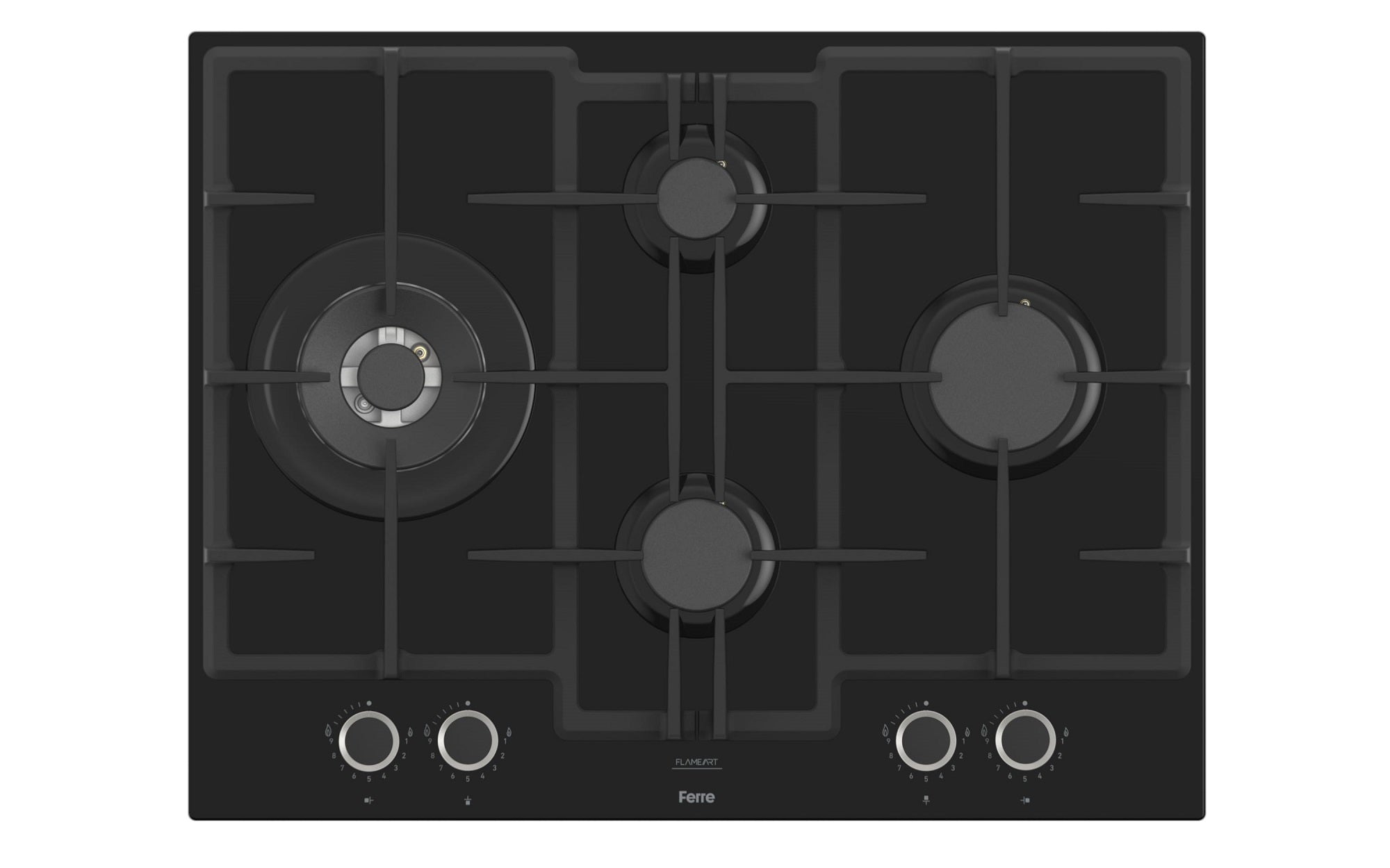 Ferre ED075WFA - 65cm FlameArt Built-in Gas Hob - 4 Burners - Cast Iron Pan Supports - Black Glass Body