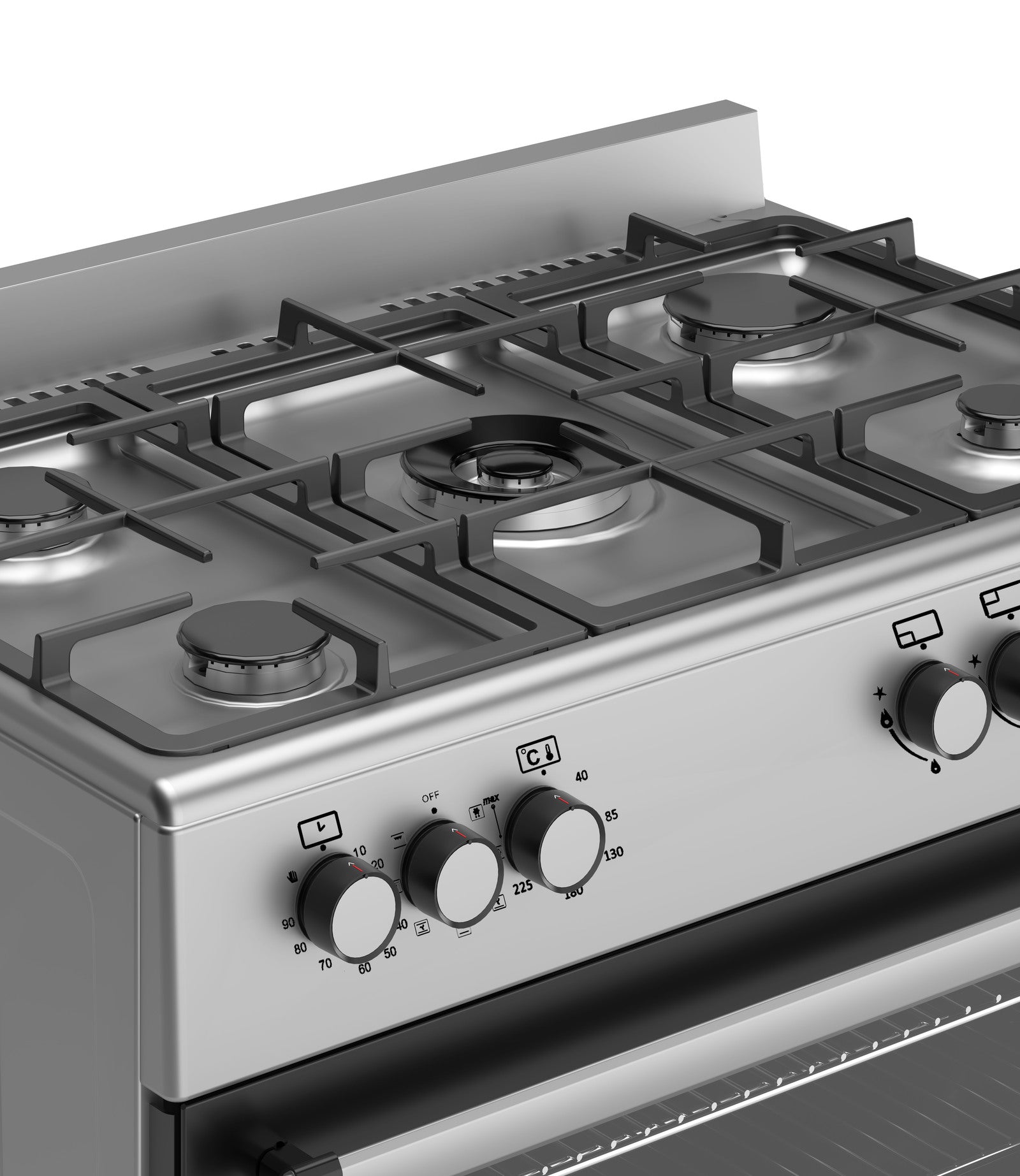 F9S50E7-X3-IN 90cm dual fuel range cooker is ideal for everyday cooking needs in larger households. Prep all your dishes in the large 110 litre multi-function oven and grill. So you can either cook up a pasta bake, or sizzle some sausages for that morning fry-up. You could even cook multiple dishes at the same time! 5 burner gas hob have a Wok Adapter and with cast-iron supports.