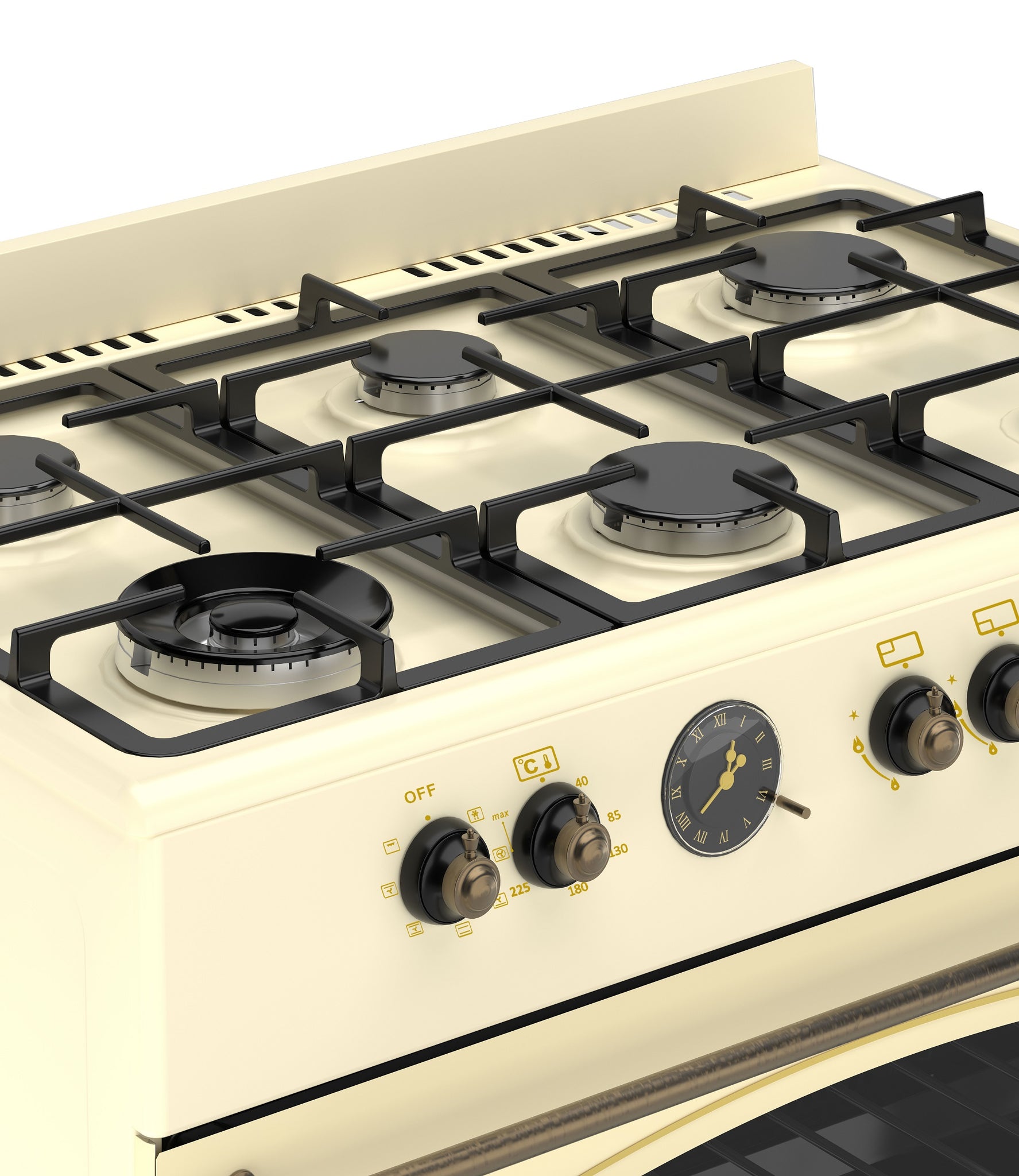 F9S60E7-CR-RETRO 90cm dual fuel range cooker is ideal for everyday cooking needs in larger households. Prep all your dishes in the large 110 litre multi-function oven and grill. So you can either cook up a pasta bake, or sizzle some sausages for that morning fry-up. You could even cook multiple dishes at the same time! 6 burner gas hob have a Wok Adapter and with cast-iron supports.