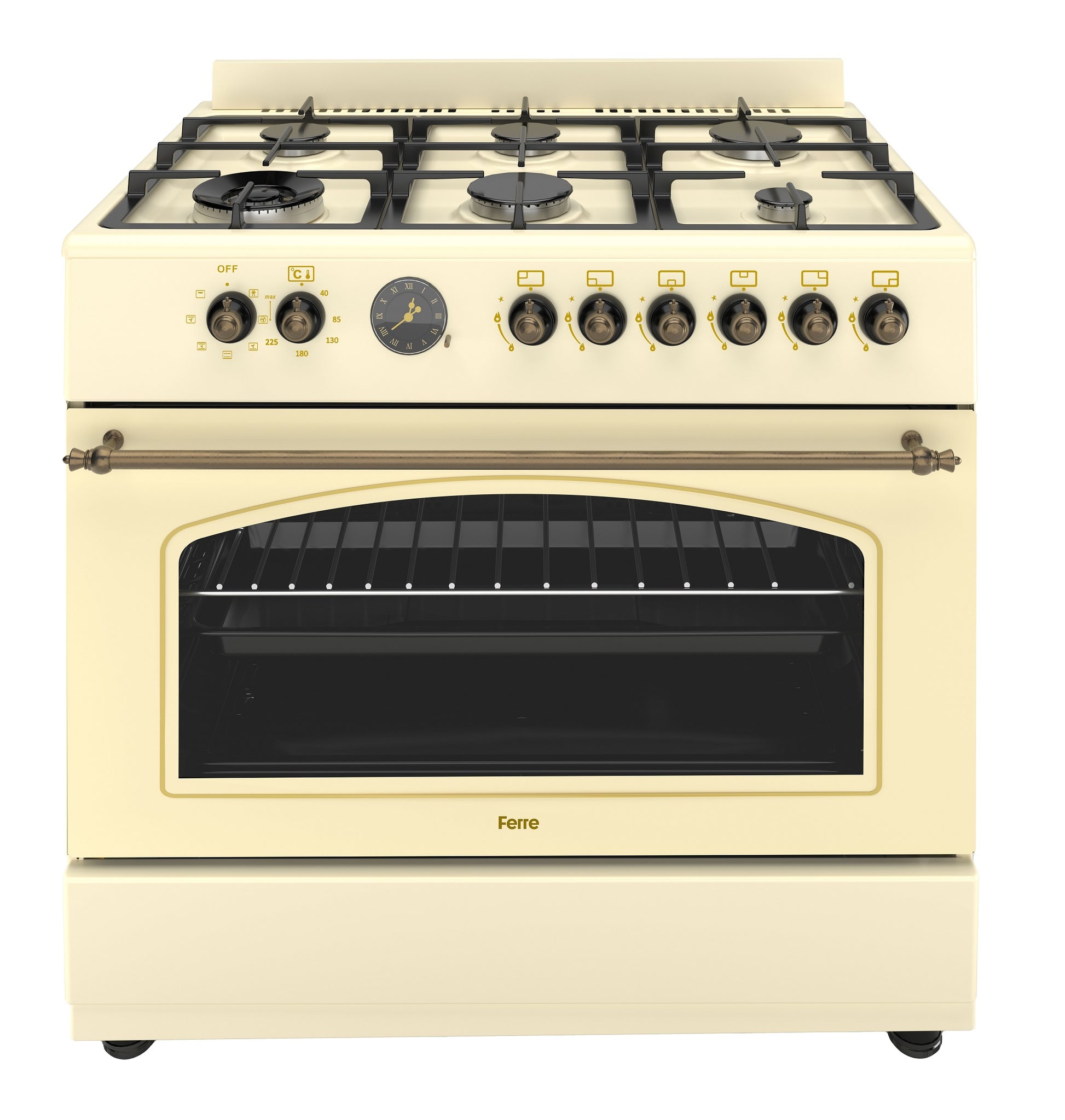 Ferre F9S60E7-CR-RETRO 90cm Dual Fuel Range Cooker With Double Turbo Fan & 6 Burner(1 Wok) - Cream